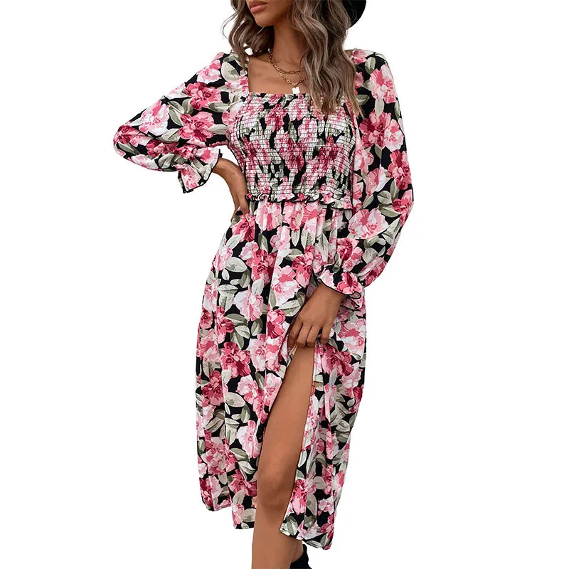 | Product Name | Autumn French Women’s Low Back Long Sleeve Square Neck Foral Printed Slit Dress |