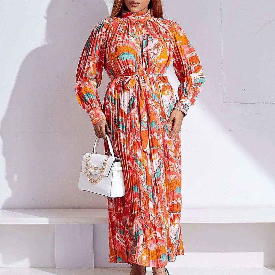 | Product Name | Plus Size Women’S Fall Winter Long Sleeve Printed Pleated Belt Maxi Dress |