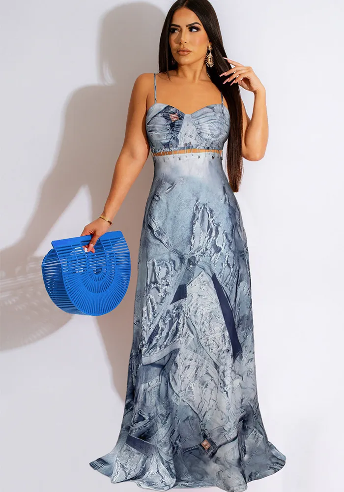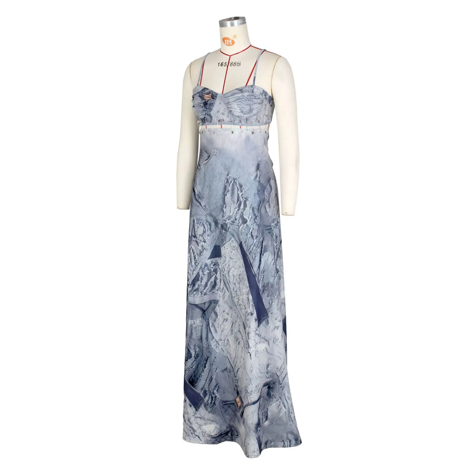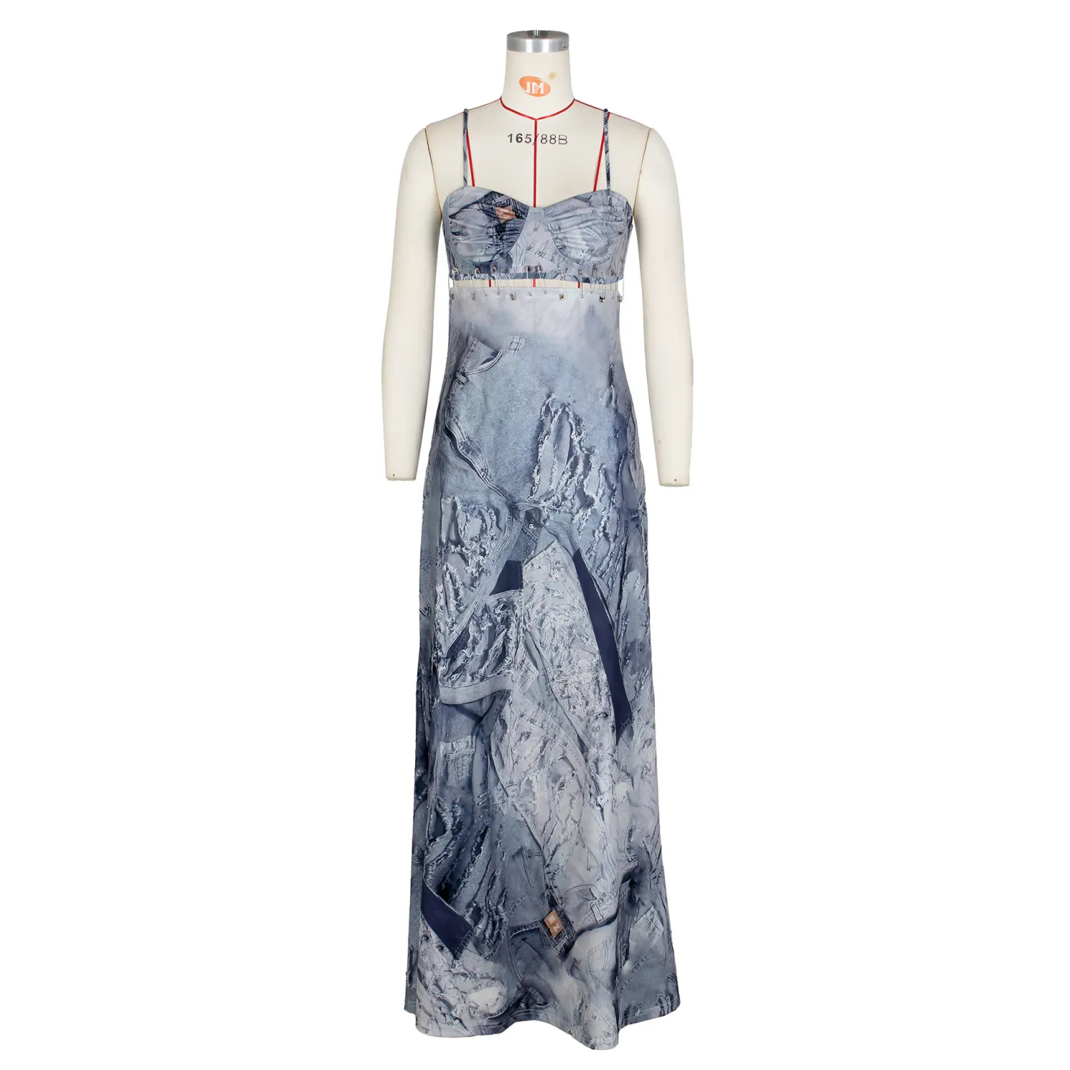 | Product Name | Sexy Ladies Denim Print Pin Embellished Backless Slip Maxi Dress |