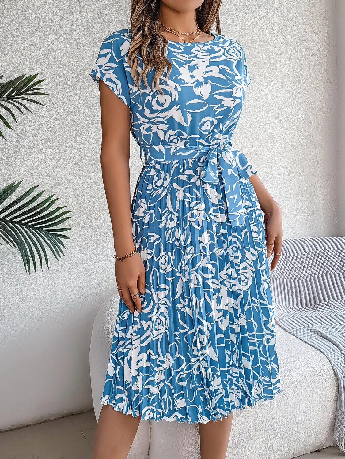| Product Name | Spring Summer Elegant Floral Short-Sleeved Casual Belt Pleated Dress |