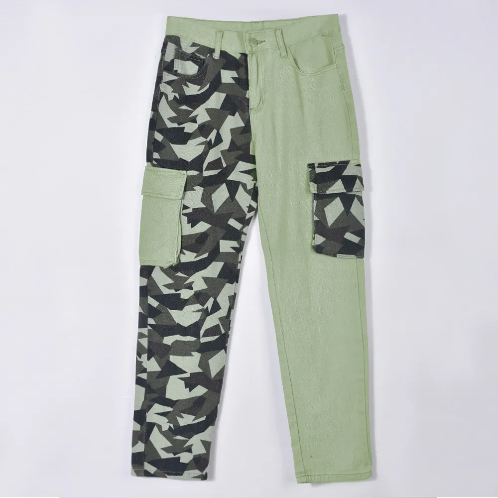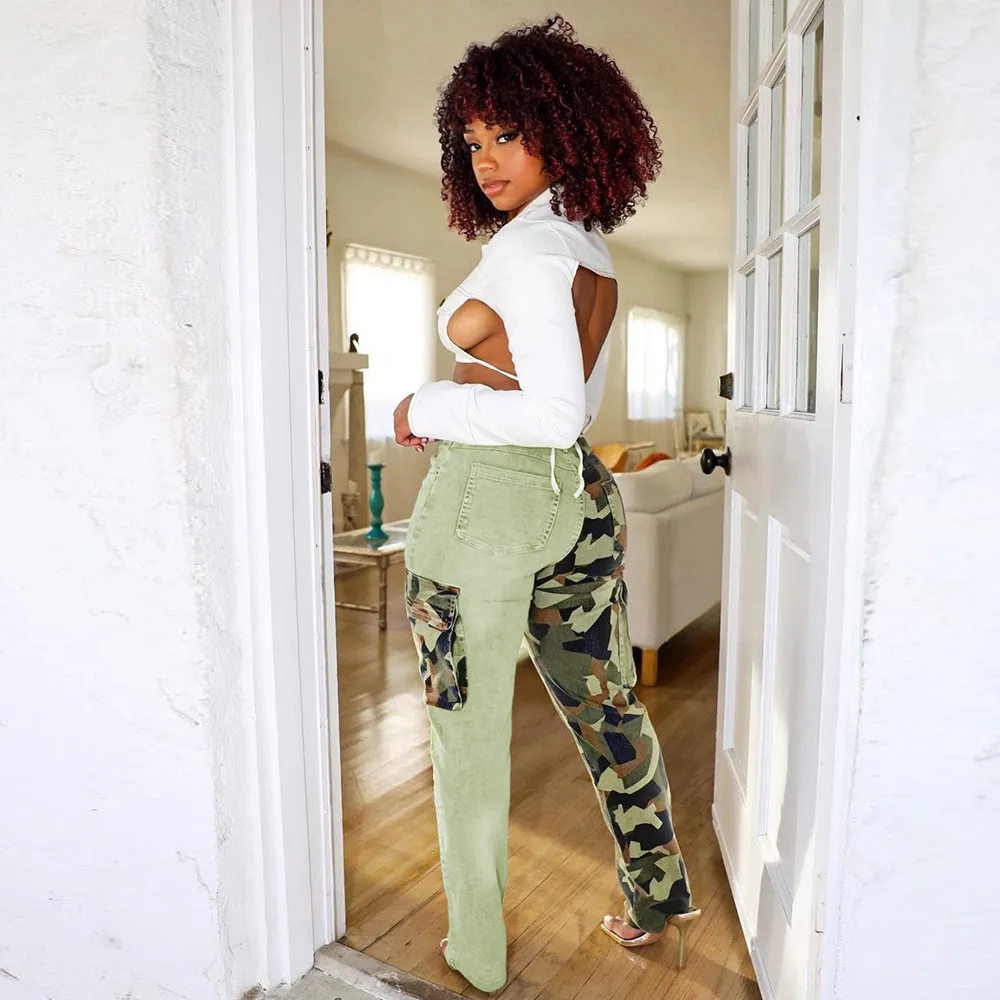 This Women Camouflage Print Contrast Style Patch Pocket Denim Straight Leg Pants Design Made Of Durable And Stretchy Jeans Fabric. It Is a Must-Have Item For Daily Life. Trendy Wholesale Jeans Is a Indispensable Item For Everyday Fashion. Womenâs Jeans With High Waist Is a Must Have Trousers That Lengthening Your Leg Lines And Tightening The Excess Flesh Of Your Waist. Grab a Must Have High Waist Jeans Wholesale For Your Closet, Just Choose Different Matching Tops To Control Every Occasion Easily.