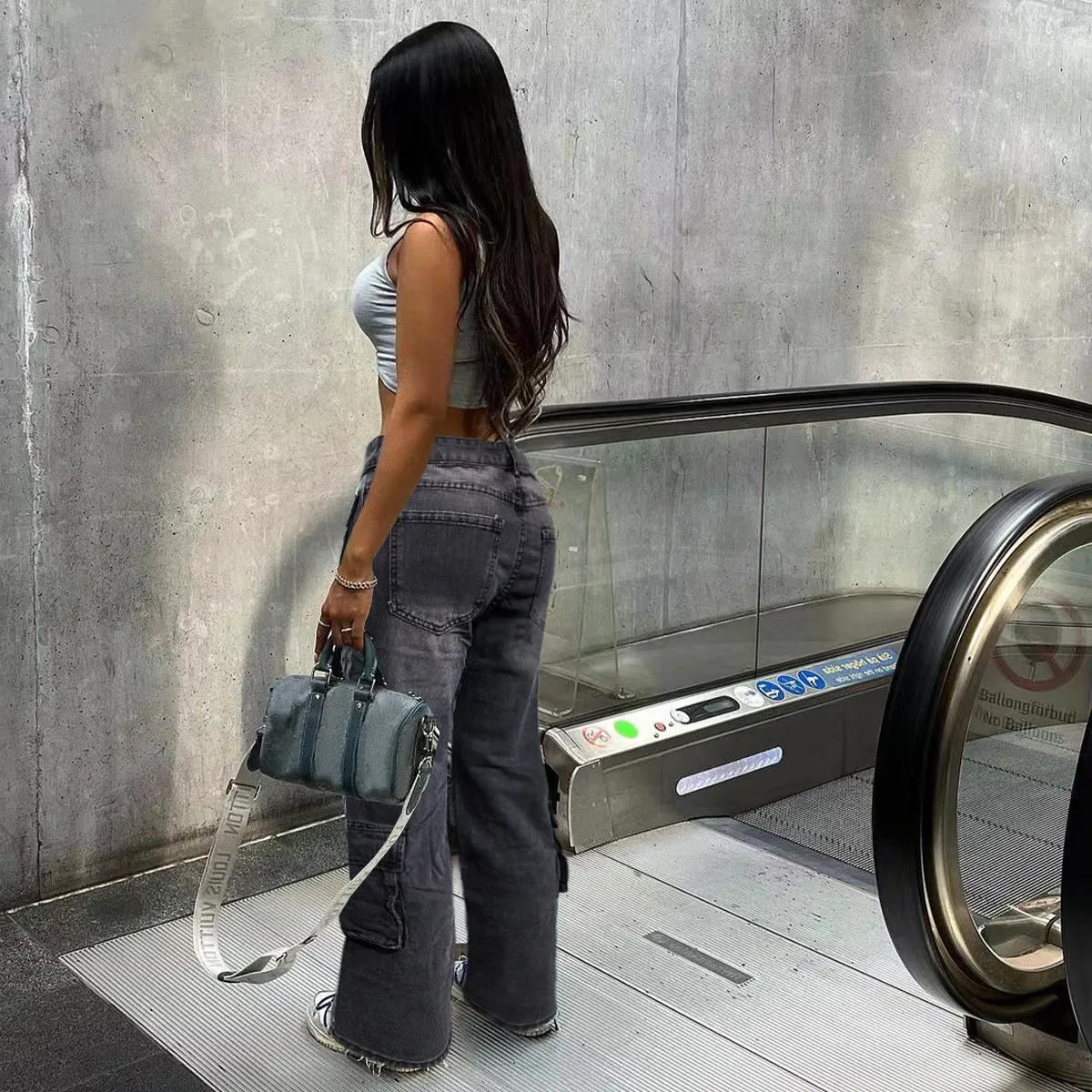 | Product Name | Women Pocket Cargo trousers Wide Leg Straight Washed Denim Pants |