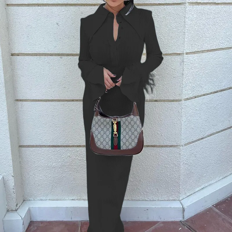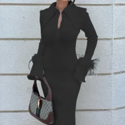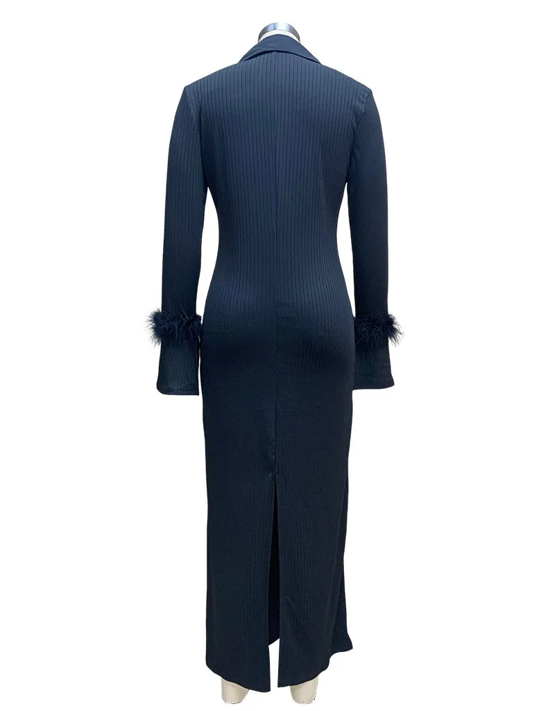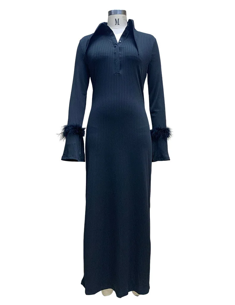 | Product Name | Women Turndown Collar Long Sleeve Feather Maxi Dress |